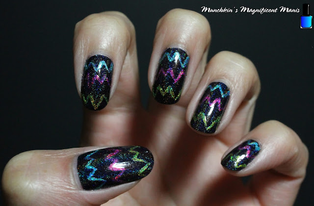 Repeat this step on all five nails, or if you would like, have most of your nails polishes with the black holo polish and the ring finger nail with the electric design.
