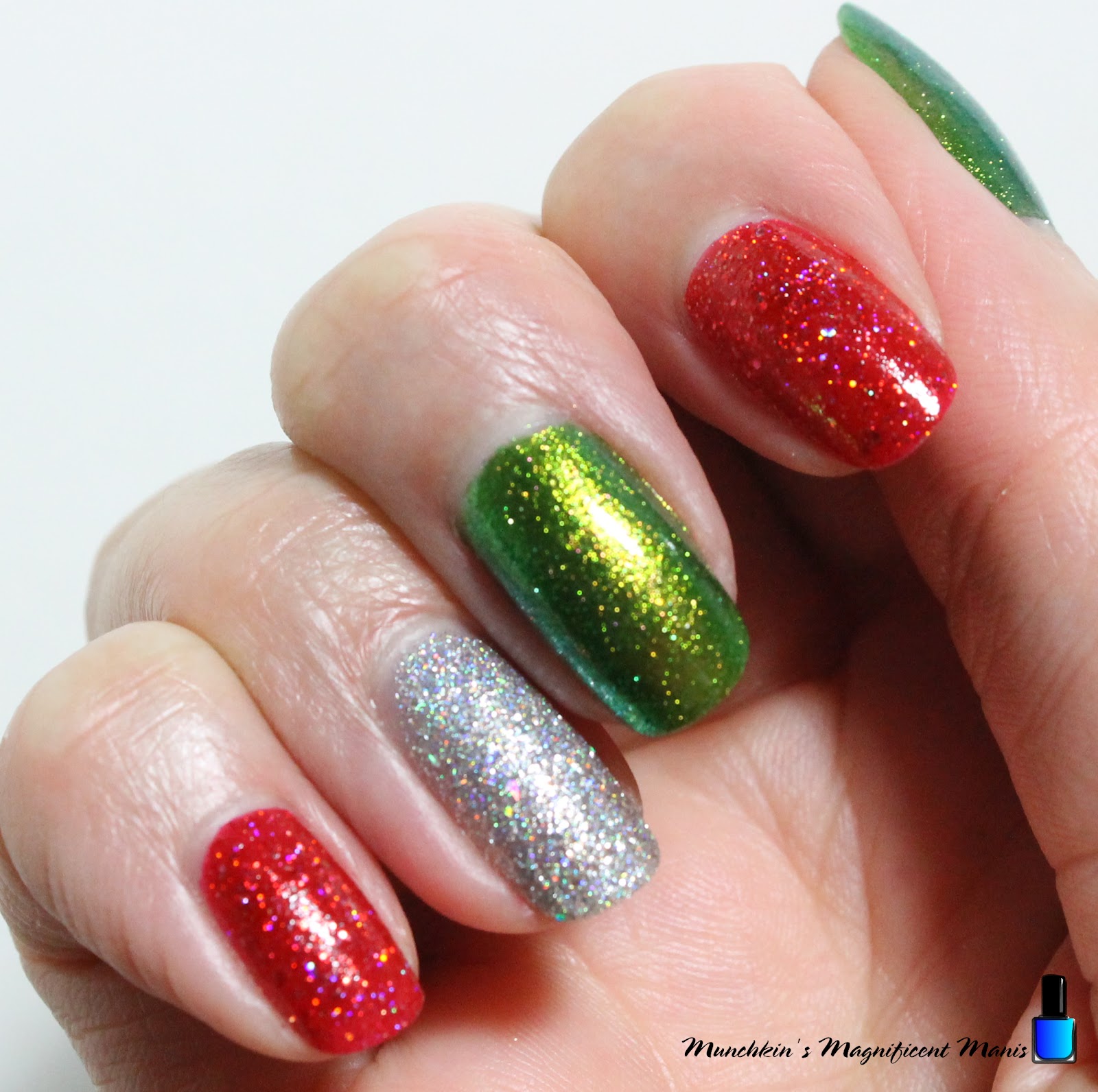 Also if you are wondering what is on my other hand, my right hand, polishes from the Holo Taco Birthstone collection. April, July, and August birthstone polishes. This makes a great Christmas color combo.